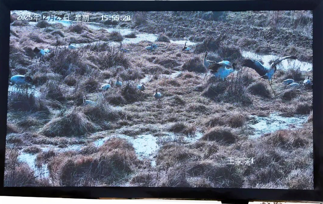 “看,那只鹤在梳理羽毛!”屏幕前,一位母亲轻声招呼孩子抬头观看。屏幕中,黑颈鹤修长的脖颈弯曲成优雅的弧线,喙尖轻轻划过羽翼,动作细腻如诗。