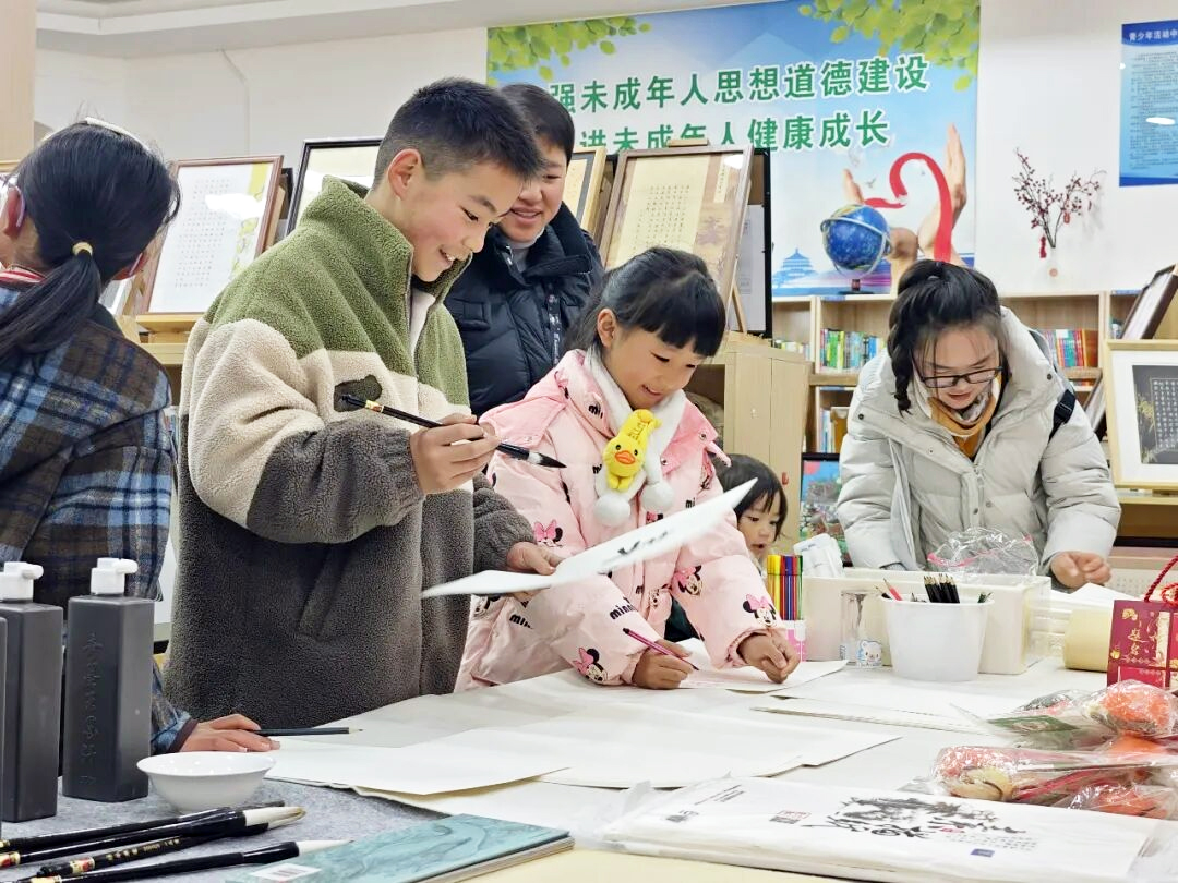 开幕仪式结束后,与会嘉宾与师生代表一同前往图书馆一楼观展研学,开展现场临摹交流。展厅内,一幅幅书画作品笔墨淋漓,一件件手工艺品匠心独具。作品中,既有孩童笔下的纯粹天趣,也有师长创作的深厚积淀,创作者们以多元艺术形式,抒发对家乡的挚爱之情,传递对传统文化的敬畏之心,礼赞新时代的发展风貌。一笔一划间,尽显非遗之神韵、民俗之温情;一纸一墨中,饱含家国之情怀、青春之活力。