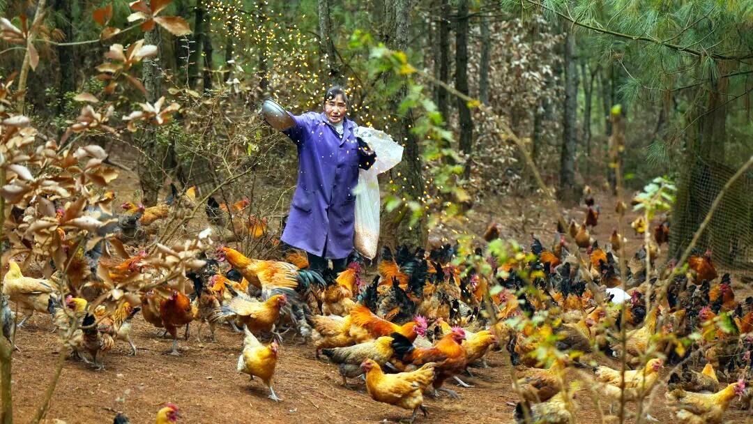工人夏贵兰给林下土鸡喂食