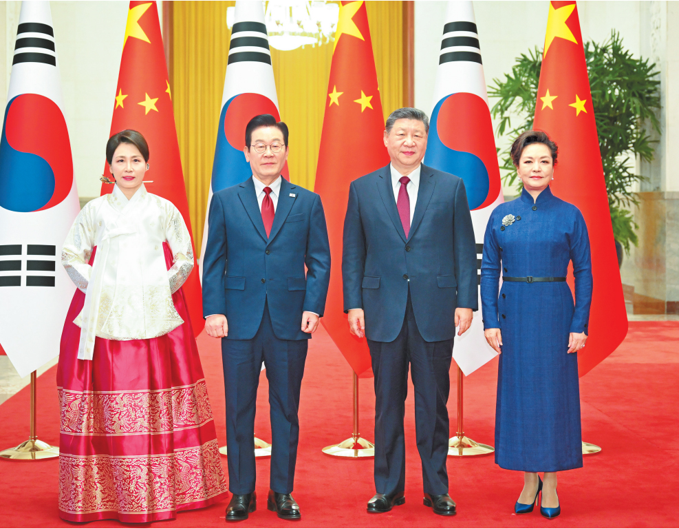 会谈前,习近平和夫人彭丽媛在人民大会堂北大厅为李在明和夫人金惠景举行欢迎仪式。