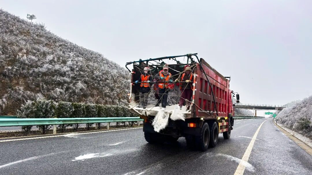 “师傅,开车尽量慢一点,确保撒融雪剂过程中路面全覆盖。大家在撒融雪剂的时候撒均匀一点,争取融冰达到最好的效果。”贵州省交通运输综合行政执法五支队七大队二中队中队长赵贤坤对除冰车驾驶员和养护人员说道。