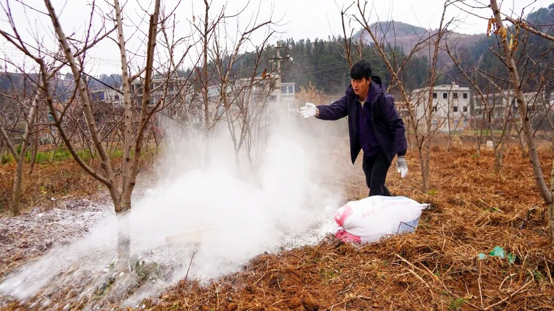 吴富军在果园撒石灰