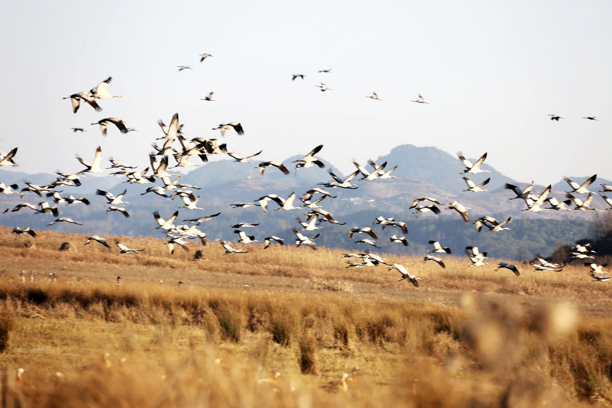 时下,草海国家级自然保护区迎来最佳观鸟期,随处可见黑颈鹤、赤麻鸭等众多鸟类休息、觅食和嬉戏的场景。(记者 罗喜贵 摄)