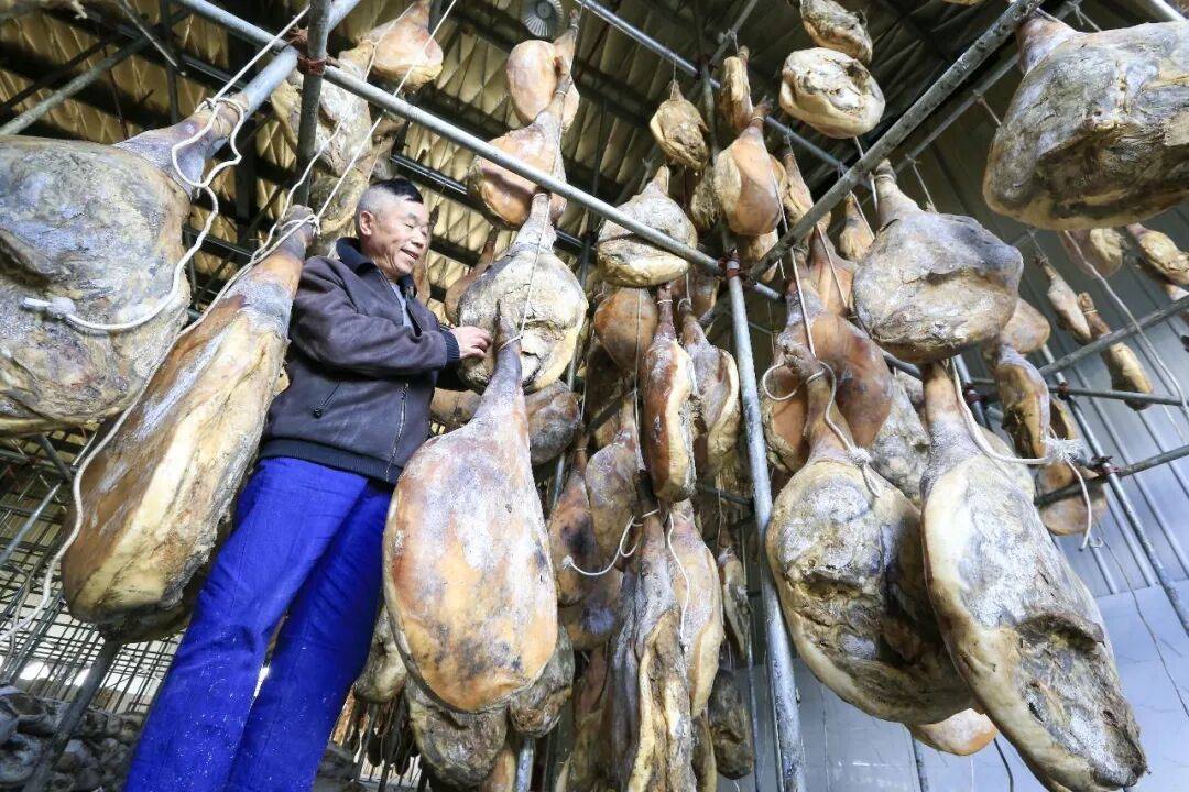 徐福绍芬火腿厂,工人正在腌制、检查火腿。