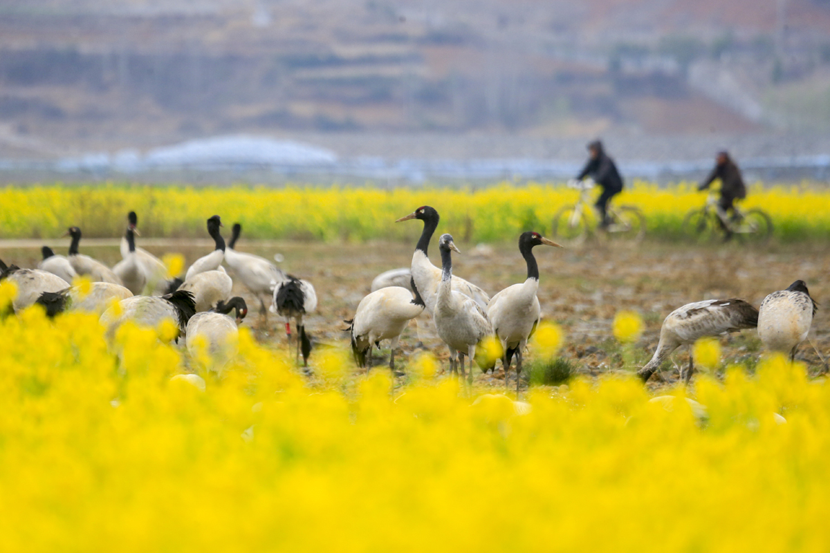 3月13日,在草海镇中海村,成群的黑颈鹤在金黄的油菜花田间活动。它们或低头觅食,或引颈高歌,或振翅齐飞,构成一幅生机盎然的春日图景。(记者 沈光勇 摄)