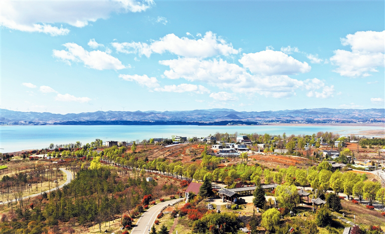 这是近日拍摄的草海北坡生态公园。春日里,公园与烟波浩渺的草海、蓝天白云相映成趣,构成一幅春日生态画卷。(记者 罗喜贵 摄)