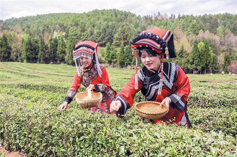 近日,游客在威宁自治县炉山镇茶园村香炉山茶园体验采茶。(通讯员 管庆巍 摄)