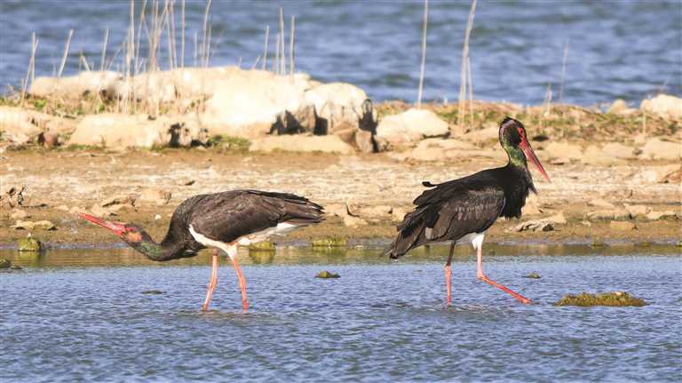 4月9日,在贵州草海国家级自然保护区拍摄的黑鹳。黑鹳是与大熊猫、东北虎同级别的国家一级重点保护野生动物,同时被列入《濒危野生动植物种国际贸易公约》附录,全球种群数量稀少,我国境内仅存1000余只。(记者 岳刚 摄)