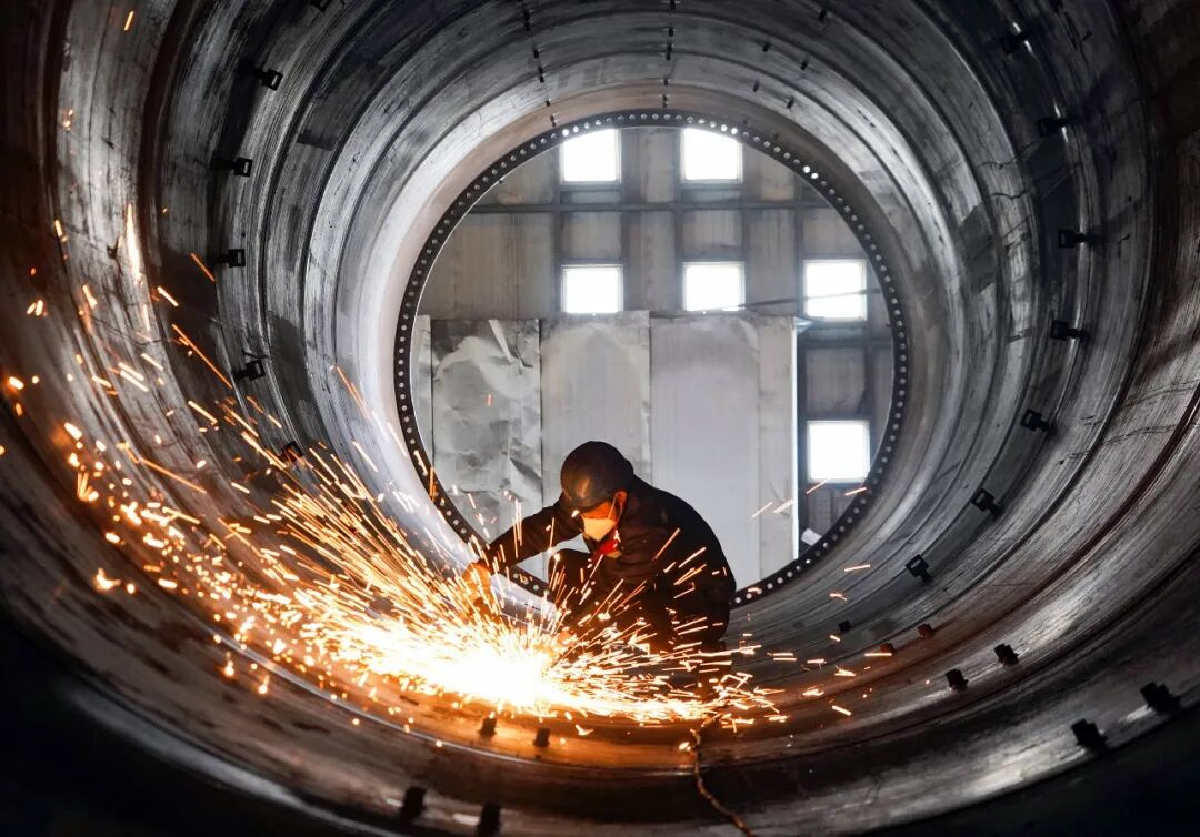 在贵州威宁经济开发区的贵州保龙设备制造有限公司风电塔筒生产车间,机器轰鸣,火光闪烁,电锯声、焊接声不绝于耳,各工区人员各负其责,紧密配合,干得热火朝天。