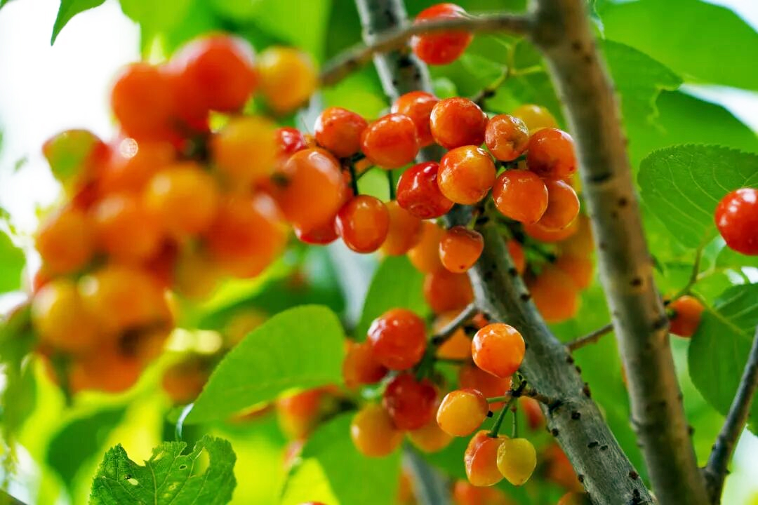 樱桃园一旁,火红的石榴花向阳盛开,圆润的蜂糖李随风摇曳,为春日果园增添了一道道亮丽的风景。该基地种植的车厘子、杨梅、蜂糖李、橘子、石榴等10余个品种的水果全部进入挂果期,实现一年四季均有鲜果可以采摘。