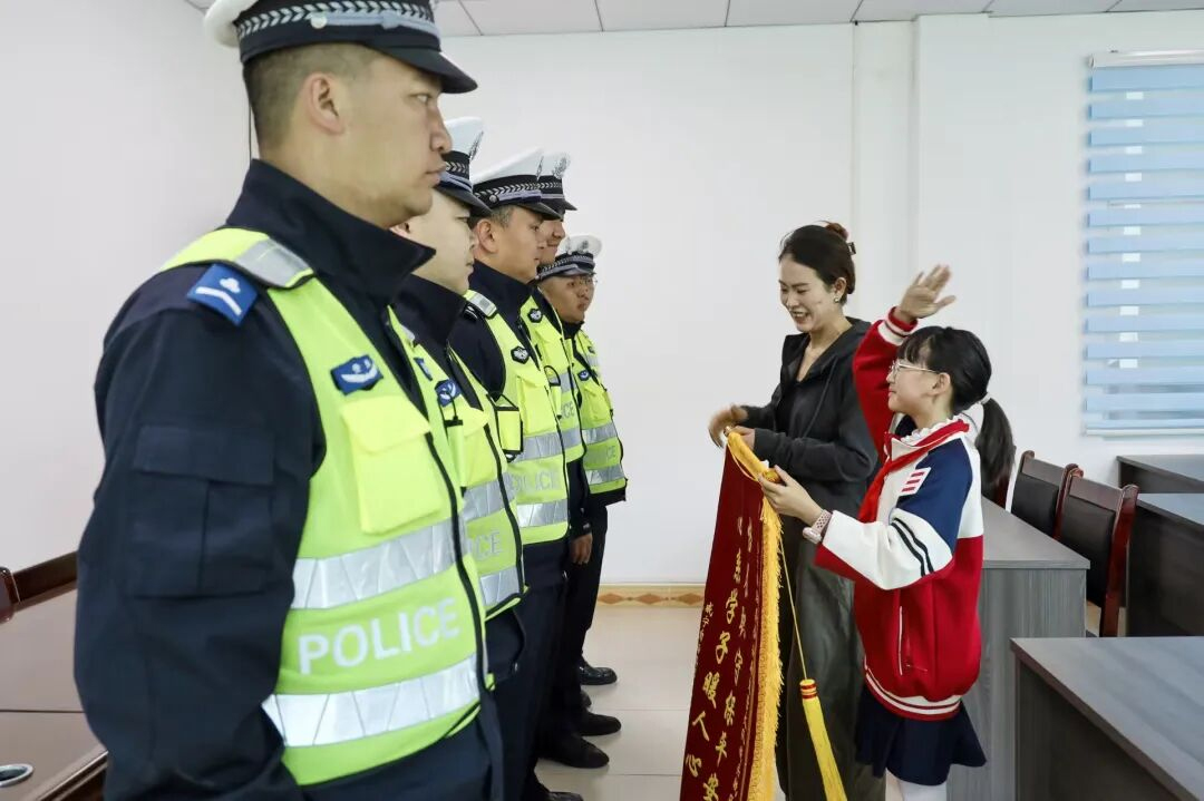 学生代表和家委代表向交管大队民辅警送上锦旗