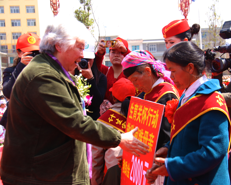 ▲中国计划生育协会原副会长、中国人口福利基金会副理事长苗霞为计生贫困母亲代表发放生产扶助金。