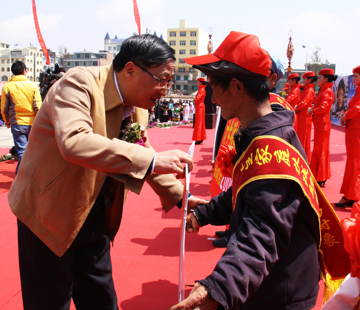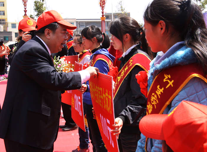 ▲市委常委、县委书记杨兴友给计生家庭学生代表发放助学金