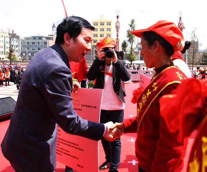▲省人口计生委党组成员、省计划生育协会专职副会长周承洲为“两户”家庭代表发放意外伤害保险单