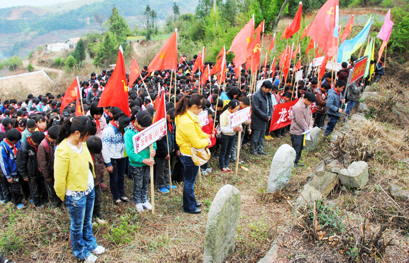 清明节期间,记者与龙场小学的600余名师生一道来到烈士墓前,为烈士荒墓清除荆棘杂草的同时,为烈士们献上了花圈、小白花,缅怀先烈。