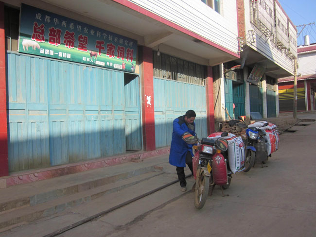 ▲近日,成都华西希望饲料公司驻哲觉服务站技术人员进村入户为群众送技术、送饲料,送药品,深受农户欢迎。图为满载饲料的摩托车。 (本报记者 胡雍辉 通讯员 文林 摄)