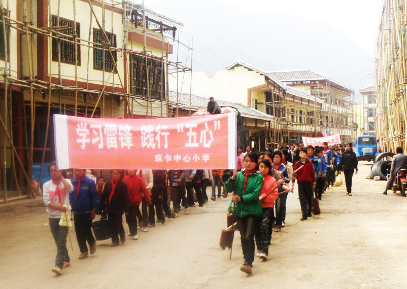 ▲3月29日,麻乍乡中心小学开展“我是环保小卫士”暨学雷锋践行“五心教育”活动,在街头巷尾清扫垃圾,争做环保小天使。活动结束后,该校组织学生在养老院帮助老人打扫卫生,擦洗门窗玻璃。此举提高了学生的环保意识,培养了学生良好的道德素质。图为学生活动现场。 (熊发愿 实习记者 姜相)