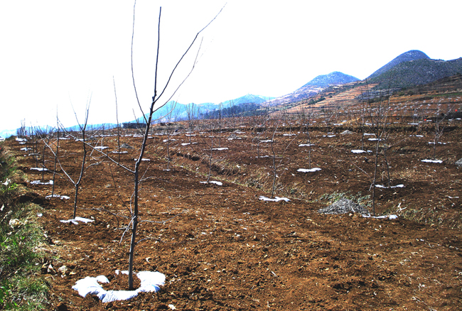 ▲作为农业部党组书记、部长韩长赋联系点的小海镇松山村,紧紧依托专业合作社、龙头农业企业的优势作用,积极调整产业结构,谋思路、做规划、定措施,加大特色农业产业发展,着力做好三农工作。该村今年积极发展大棚蔬菜1000多亩、烤烟2300亩、马铃薯6000亩、中药材2000亩的同时,结合当地独特的气候条件,实施精品苹果示范基地1000亩建设。以上特色农业种植项目完成后,可使该村1000余人的劳动力得以转移就业、可助该村农户快速增收。图为已经种植完成的精品苹果基地。(本报记者 张锋)
