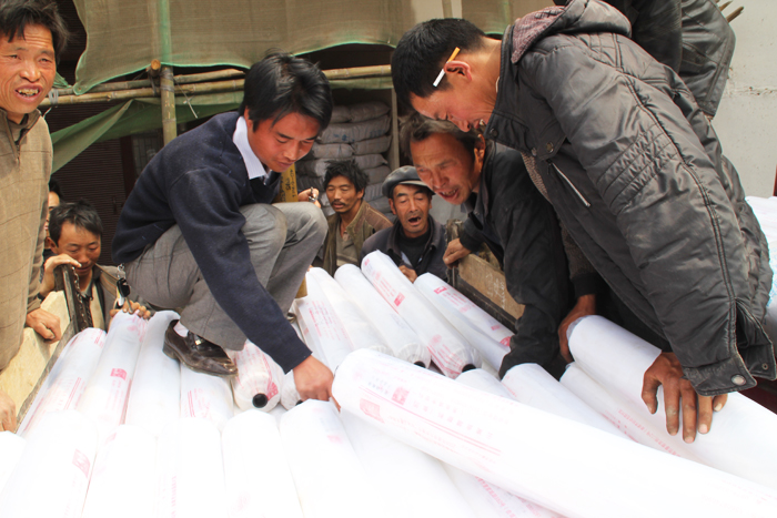 ▲时下,正是春耕繁忙季节,迤那镇田间地头到处是一片繁忙的景象,家家户户正在忙着播种。据了解,该镇积极采购种子和春耕物资,为群众免费发放优质玉米种子7.65吨,地膜8.1吨。图为工作人员正在为村民发放地膜。 (林荣君 摄)