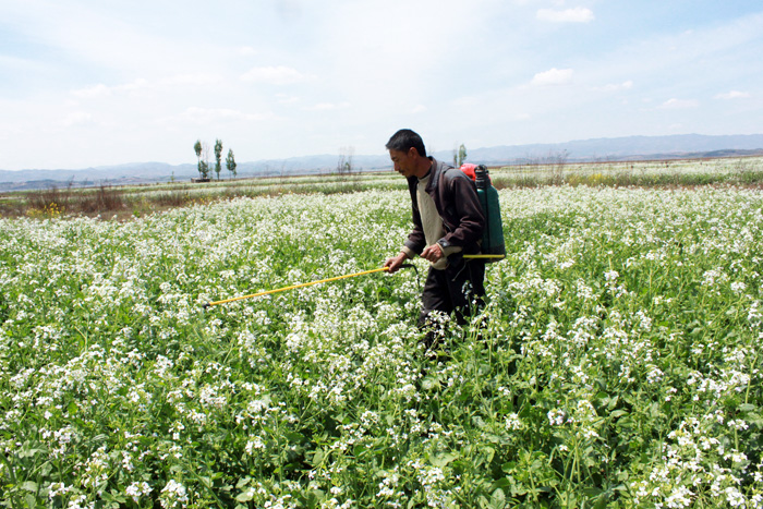 ▲近年来,草海湖畔的萝卜种在市场上价格一路走高,一般在30至40元一市斤左右。尝到甜头的农民大面积植萝卜。据了解,草海边的萝卜种子,由于种出的萝卜个大、味甜,市场销量逐年递增。图为农民正在地里打农药。 (本报记者 李玉荣 摄)