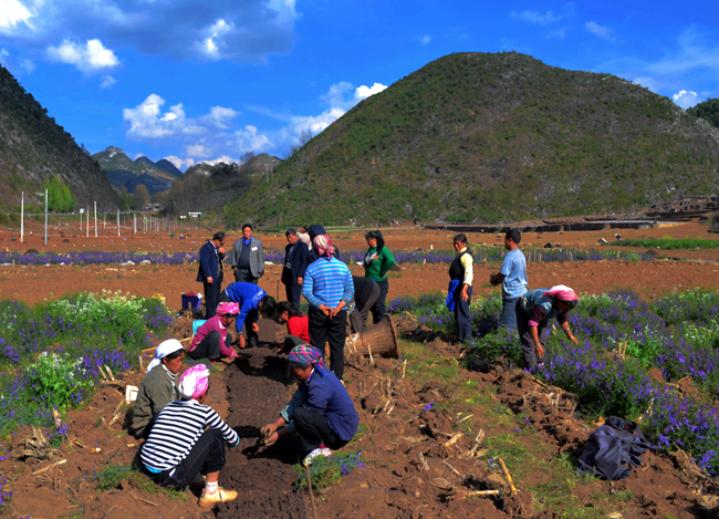 据了解,今年该镇种植核桃3000亩,烤烟5500亩,草莓25亩,完成杂交玉米地膜覆盖定向移栽示范650亩。图为村民正在进行营养坨育苗。