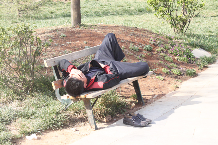 ▲近日,记者在会展中心广场见到一位“哥们儿”,把公共椅子当作自家的床,脱掉鞋子,酣然入睡,且不说袜子臭气熏天,污染空气,也不说其不重视形象,败坏游人雅兴,单说其庞大的身躯横在椅子上,椅子随时有“翻斗”的可能,就让人为他、也为椅子捏一把汗。(本报记者 肖林 摄)