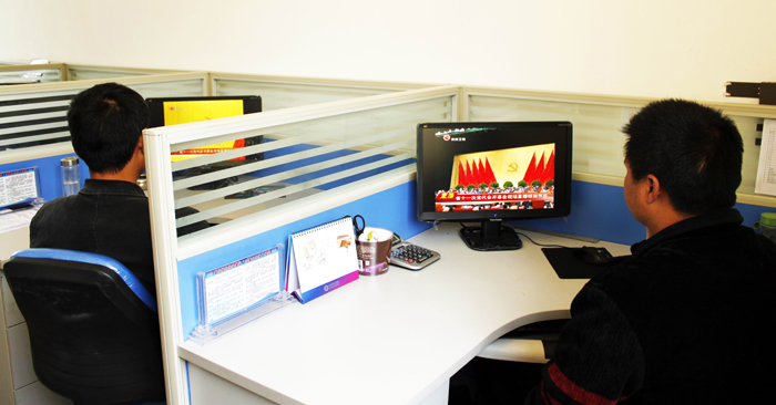 ▲贵州省第十一次党代会于4月15日上午9时隆重开幕。我县认真组织全县广大干部职工准时对直播实况进行了收看、学习和讨论。图为威宁报社职工在收看直播实况。(本报记者 张锋 摄)