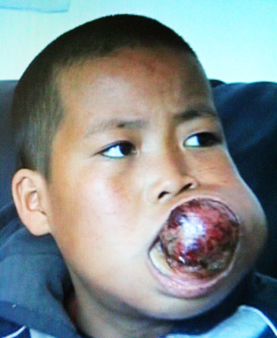 日前,记者了解到,小万鹏嘴里已经被肿瘤塞得满满的,左脸颊高高鼓起,整个人已经被病痛折磨得萎靡不振,说话十分困难。在肿瘤的挤压下,文万鹏的下颚已严重变形,呼吸、进食等功能已经受到严重影响。“如果不及时进行手术治疗,肿瘤有可能恶化,仅剩的进食通道也将完全堵塞,文万鹏的生命岌岌可危” 当地医院医生告诉记者。