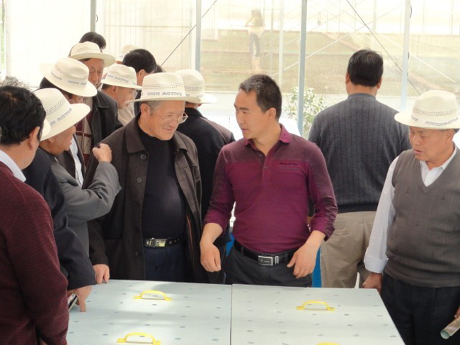 ▲近日,县政协、县委组织部、离退局共同组织20余位离退休老干部到草海泰丰特色农业示范基地、双龙乡西梁山龙源风力发电场参观考察工、农业生产建设情况。图为草海泰丰特色农业示范基地技术员为老同志讲解种植技术。 (卯 燕)