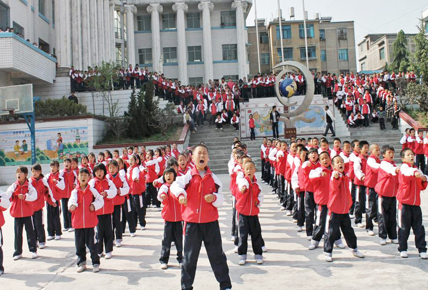 ▲4月18日,威宁二小举行武术健身操比赛。这是该校响应教育部倡议,认真开展大课间体育活动,提高学生身体素质的新创举。图为学生在操场上表演武术健身操。(本报记者 沈光勇 通讯员 肖琼 摄)