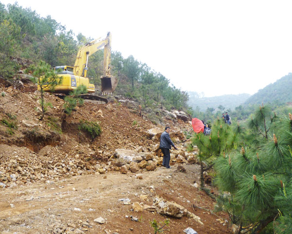 ▲全长12公里,总投资100余万元的羊街镇大夹沟至箐脚村通村公路建设正在加紧施工。据悉,该公路修通后,可解决箐脚和松林两个村5000余名群众出行难,拉动两村及沿线经济发展。图为施工现场。 (毛庆松)