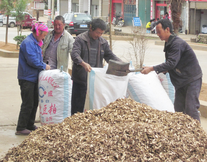 ▲近年来,哲觉镇把白术种植作为短、平、快特色产业来抓,去年,该镇种植白术700余亩,目前,收购价格不断上涨,每公斤达15至17元。图为村民正在装袋发车。 (文林 摄)