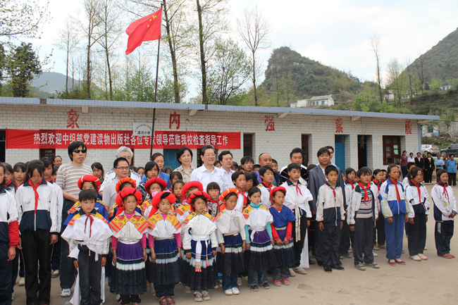4月24日,中组部党建读物出版社社长王占生一行在县委副书记、草海管理局党委书记冯兴忠,市委组织部副部长黄家忠的陪同下到板底乡清河小学考察调研。中组部党建读物出版社将无偿为该校修建一栋多媒体图书室,并同时捐赠书籍、电脑等学习用品。图为考察后王占生与师生代表合影。 (王超 摄)