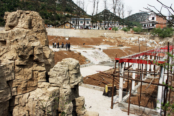 ▲近年来,金钟镇在“四在农家”创建中, 把自然石山建设与生态休闲结合起来,投资200多万元在大营村修建生态小广场,该生态小广场涵盖有自然石山景观、葡萄架长廊、梨园、亭子、停车场等建设项目,该工程将于5月底前完工,图为正在建设中的大营村生态小广场。(本报记者 张锋 摄)