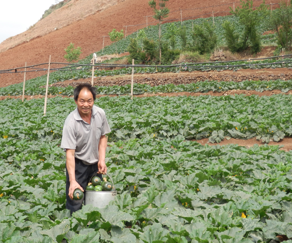 面对去冬今春严重的旱情,玉龙乡党委政府积极引导扶持农民因地制宜发展耐旱早熟作物,在该乡和平村新田组利用远程教育学用成果示范点,发展蕃茄、大蒜、豇豆、南瓜、三叶瓜、四季豆等10多个品种共计600多亩的无公害春季早熟蔬菜。图为大旱之后该乡和平村新田组钟二柱种植三叶瓜喜获丰收。(田合平 摄)