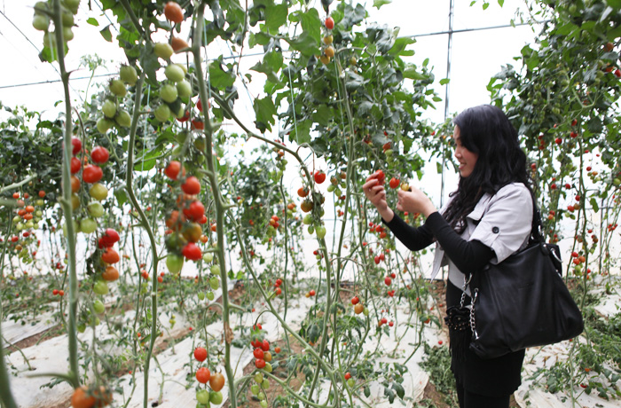 ▲近年来,草海镇依托资源优势,大力调整农业产业结构,积极招商引资,引进山东龙头企业乐义集团等多家企业建设无公害蔬菜种植基地,倾力打造特色农业品牌,加快了农业产业化步伐。图为游客草海镇乐义百家蔬菜基地冬暖式大棚里采摘番茄。