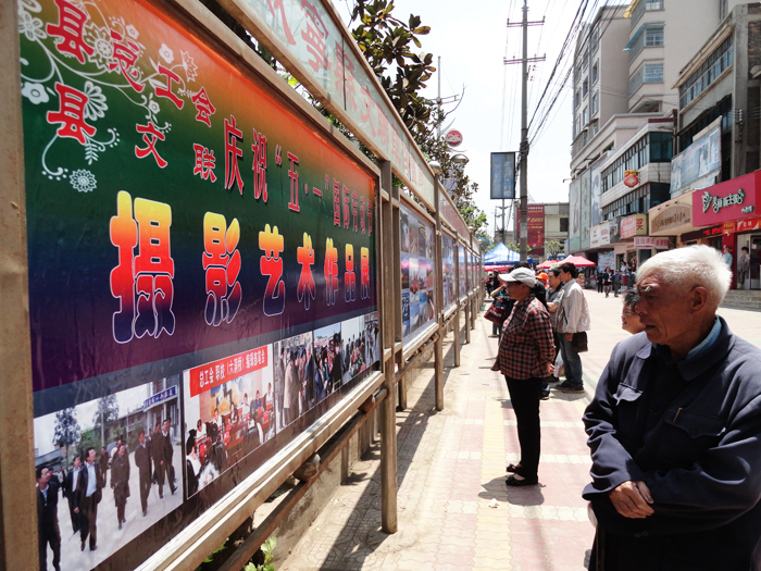 ▲5月1日,县总工会、县文联在县城人民中路“草海画廊”举办了“庆祝‘五一’国际劳动节”摄影艺术作品展,共展出反映工人生活、城市建设、自然风光等内容的摄影作品8幅,受到广大观众的好评。图为过往行人在观看摄影作品。