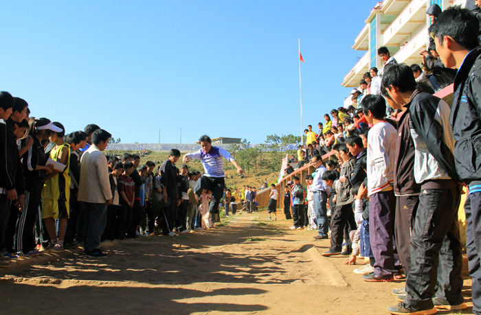 ▲5月3日,海拉乡海拉中学举行为期三天的分为教师组和学生组的篮球、乒乓球、羽毛球、三级跳远等九个运动项目体育运动会,庆祝第93个“五四”青年节,全校1400多师生参加了运动会。图为跳远项目比赛现场。 (王再兵 孔德亚 摄)