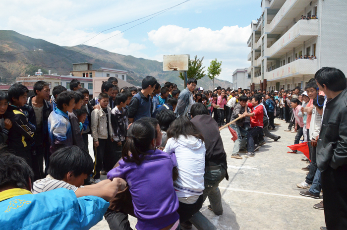 ▲岔河乡岔河中学以拔河、文艺表演等丰富多彩的活动形式纪念“五·四”运动93周年,传承红色精神。图为同学们正在拔河比赛。 (李华 摄)