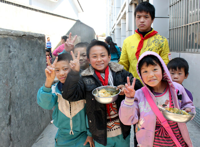 当看到笔者照相机的镜头正对着他们打午餐的情景时,孩子们纷纷跑到镜头前,端起手里盛着饭菜的碗,竖起大拇指向笔者比划着饭菜是否可口的手势。