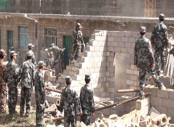 近日,城乡规划执法大队根据县委政府的指示,出动100名执法队员,依法对草海镇环城路边的塔山村、阳光大道沿线等规划区内的12户825平方米违法建筑进行拆除。据了解,该违法建筑严重阻碍了观海国际、奥体花园房开项目的建设和周围村民的生产、生活,在当地造成了恶劣的影响。图为拆除现场。 (蒲晟 摄)