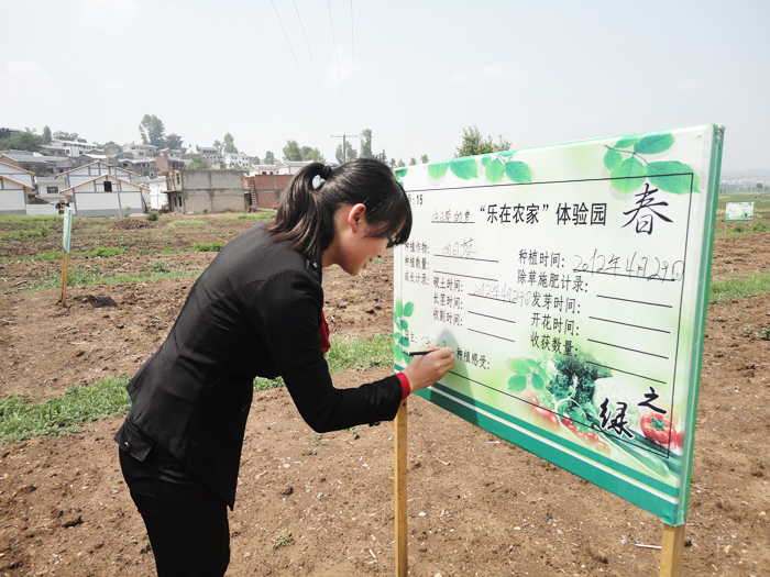 在该村正在建设的体验园里,笔者看到10亩左右的土地被划分成30块小园地,每块小园地里都有个醒目的标识牌,上面写着些颇具诗意的名字:向日葵的梦、缘之园、喜羊羊的菜园子……据介绍,这些小园地被村民以每块500元的价格租给了城里人,城里人通过与农户一对一签订租地协议,获得了政府统一颁发的“乐在农家体验园”园证,成了该村名副其实的村民。园主在承租期间享有所租园地的命名权、种植权和收益权,可通过自主组织种植和处理收益来体验农家生活,寻找田园归属感和种植成就感。