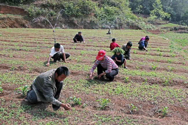 ▲近年来,我县依托独特的自然优势,在哲觉、黑石头、迤那、海拉等乡镇大力发展中药材种植,走特色农业发展之路,助农增产增收致富。图为哲觉镇里可村村民正在给党参育苗基地里除草。