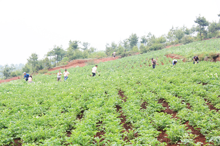▲时下,正值马铃薯施肥除草季节。盐仓镇邓营村一户马铃薯种植大户边薅洋芋边说,今年的洋芋长势很好,如果风调雨顺,收成肯定不错。据了解,今年我县种植马铃薯170.3万亩,比去年扩大5万亩。图为村民正在地里薅洋芋。
