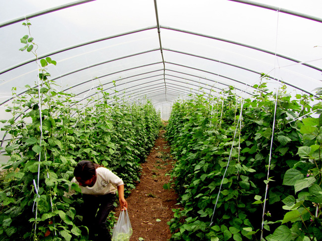 麻乍乡加快农业产业结构调整,在双包塘村采取土地流转方式建成了43个钢架大棚,里面种植的大白菜、青刀豆等长势喜人,品质良好,市场供不应求。图为菜农正在大棚里采收青刀豆。