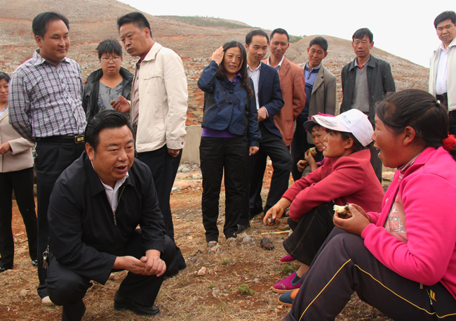 走出山头,杨兴友书记看到,垫石铺路的老百姓正三五成群围在一起吃火烧洋芋。他又走过去,亲切的与大家交谈,了解大家的生产生活情况和家庭情况。老百姓们听说书记是亲自来为大家解决吃水困难的,再过两个月,吃水就不愁了。大家都高兴地说,还真没想到这深山里书记会来,还为大家解决了大难题。