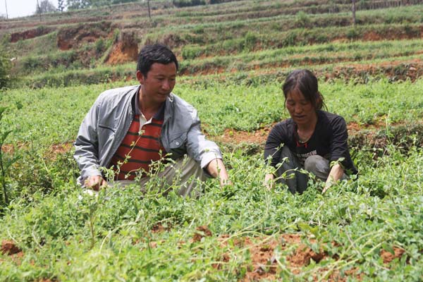 ▲哲觉镇银红村村民姬兴茂是当地出了名的创业致富带头人,去年,他与村里10个青年一起创办了兴茂种养殖专业合作社,现以发展党参200亩,折耳根300亩,还种植了10亩野生天麻等中药材,带动周边300多户1000多农户参与种植。据悉,他创办的合作社采取支部+基地+合作社+农户的运作模式,并下设技术指导、基地培训、回收销售等小组,先后与安徽毫州、福建漳州、威宁片籽黄等多家药材商签订了订单合同。图为姬兴茂正在指导药农如何加强党参田间管理。(本报记者 王德聪 摄)
