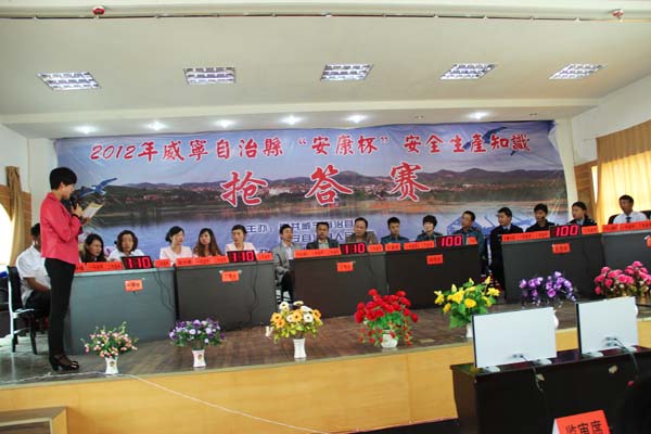 ▲5月20日,由县委政府主办,县安监局、文体广电旅游局组织的安康杯安全生产知识竞赛活动圆满结束。经过紧张的抢答,最终县交警大队荣获第一名,草海镇政府、振华煤矿分别获得第二名,交通运输局等三个单位获三名。图为抢答赛现场。