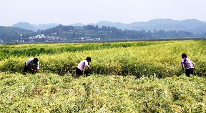 ▲5月26日,草海镇西海村的农户正在忙着收割萝卜种子。据了解,该村常年种植上千亩马桩大白萝卜苗,年收种籽达2万斤,平均每斤15元,仅此一项该村年收入可达30万元左右。