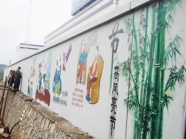 ▲为推进廉政文化覆盖面,日前,黑石头镇在交通要道及显眼的墙上制作漫画,使廉政文化更加形象化、具体化,让群众一看就懂。图为绘画现场。(本报记者 唐明军 摄)